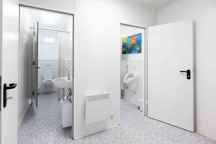 ELA Sanitärcontainer gibt es in unterschiedlichen Ausstattungsvarianten und Größen, darunter auch geschlechtergetrennte Sanitärbereiche.