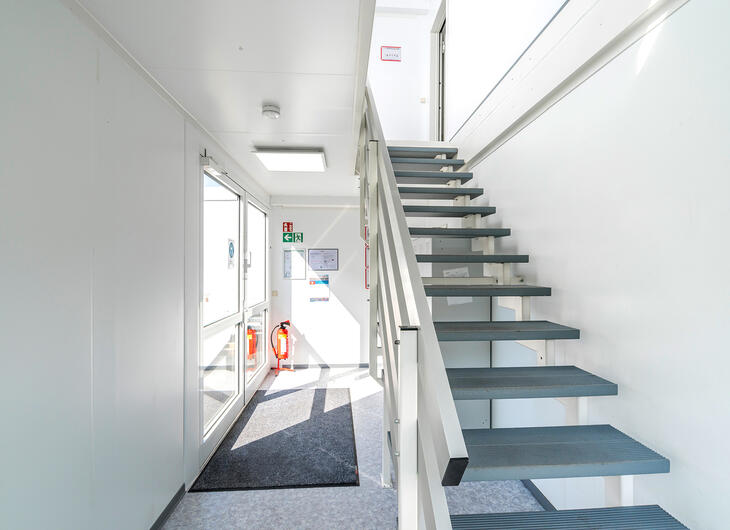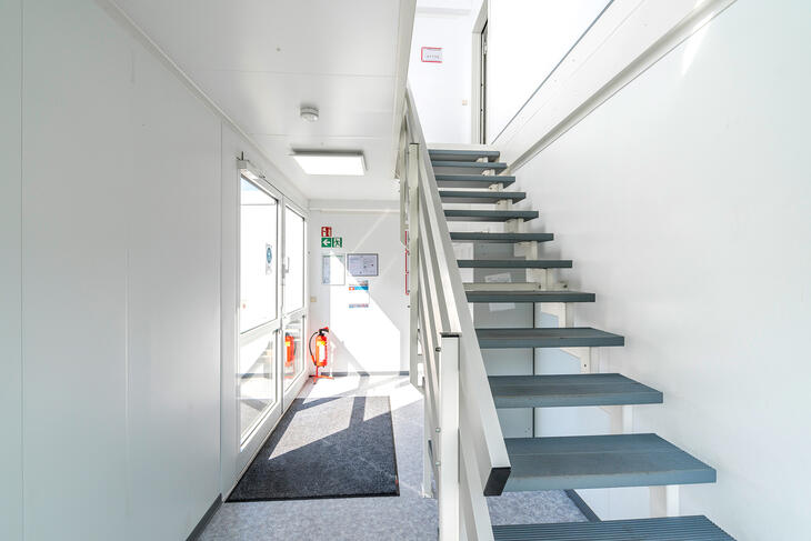 Die einzelnen Räume in einer Containeranlage für Schulen können über ein innenliegendes Flursystem einfach miteinander verbunden werden. Das spart Platz und ermöglicht einen bequemen Wechsel der Klassenzimmer auch über Etagen hinweg.