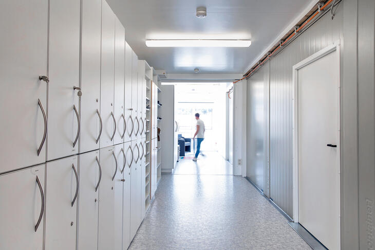 Die einzelnen Büroräume in einer Containeranlage für Schulen können über ein innenliegendes Flursystem einfach miteinander verbunden werden. Das spart Platz und ermöglicht einen bequemen Wechsel der Büroräume auch über Etagen hinweg. Die ELA Bürocontainer werden auf Wunsch voll ausgestattet. Der Mobiliarpool umfasst Schreibtische, Drehstühle, Aktenschränke in verschiedenen Größen, Kommunikationstechnik und Whiteboards.