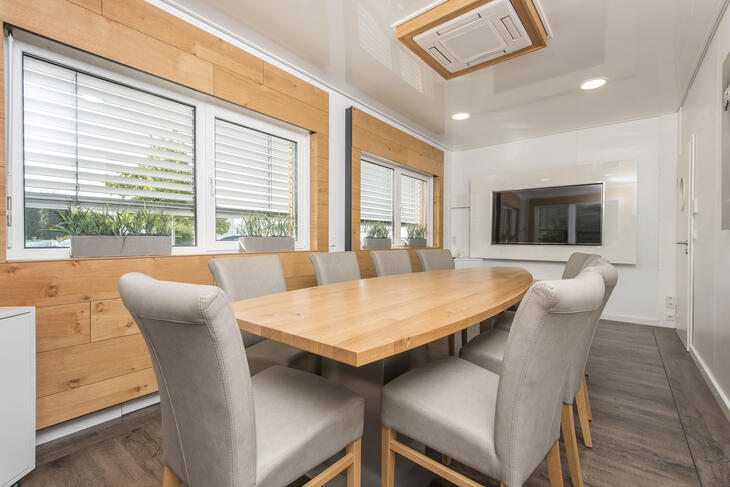 ELA Bürocontainer zum Mieten und Kaufen sind als Seminar- und Schulungsraum flexibel einsetzbar – sowohl innerhalb von Containeranlagen als auch als Ergänzung zum Festgebäude. Die zu Seminarräumen kombinierten Bürocontainer von ELA sind voll ausgestattet mit Stühlen, Tischen, Whiteboard und Kommunikationstechnik. Schüler und Lehrer profitieren von einem guten Raumklima, angenehmer Akustik und moderner Innengestaltung.